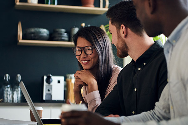 • Two business people both looking at a computer screen, gesturing and smiling.